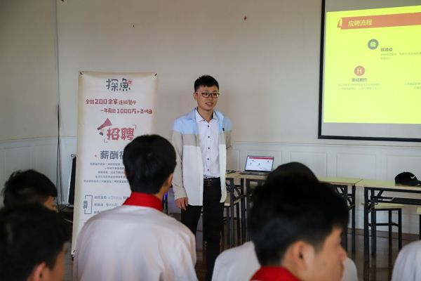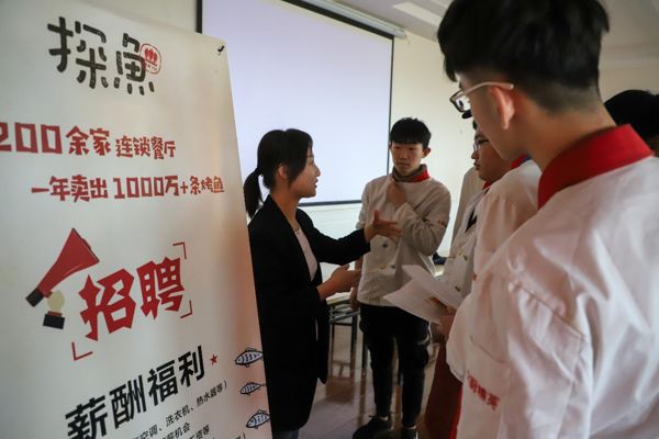 在宣讲会中,山东新东方烹饪学院2018届毕业学子仲崇山同学作为在甘棠明善旗下探鱼品牌成功就业的学子代表参加了此次宣讲会,他分享了自己在就业单位工作的晋升情况和职场经验,给予学弟学妹们学习的建议,希望学弟学妹通过努力和坚持,也可以向现在的他一样,通过学院的创就业平台走向就业单位,工作9个月就可以做到厨房主管,月入6000+。
